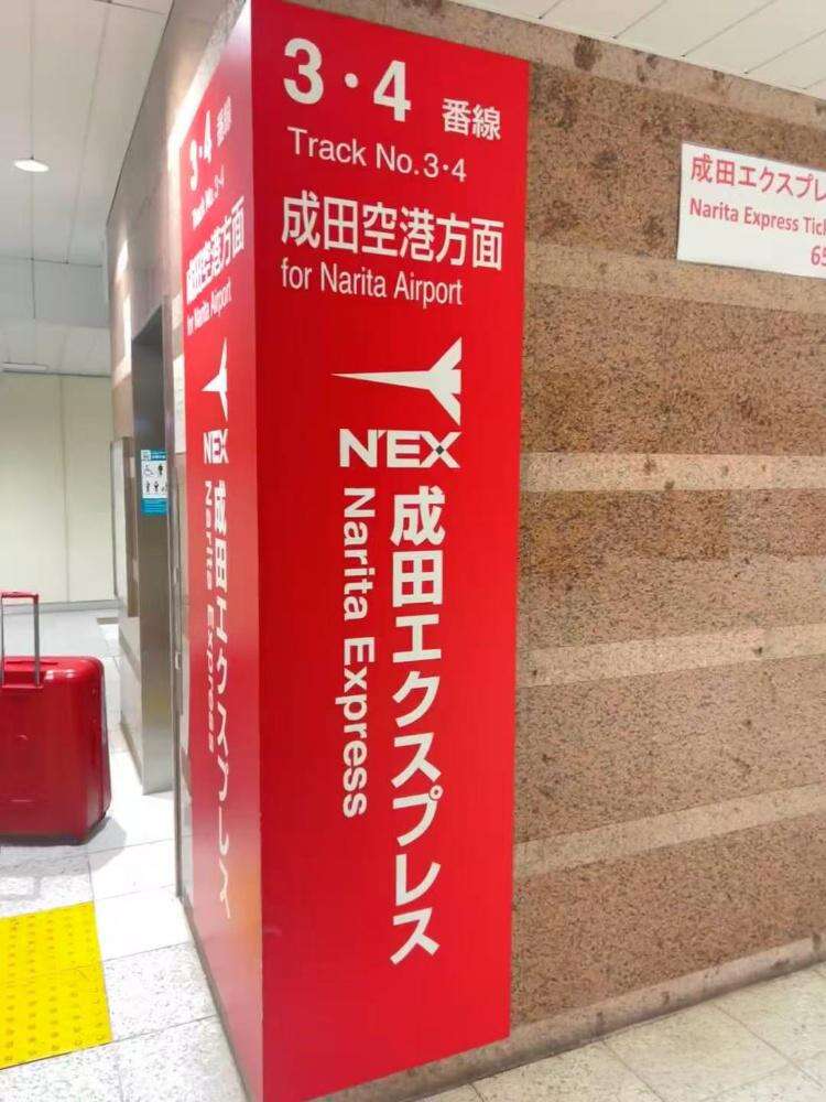 The Narita Express (N'EX) takes about 1 hour from Tokyo Station to Narita Airport with frequent departures, boarding at the underground Sōbu Line platforms marked by highly visible red signs with white text.