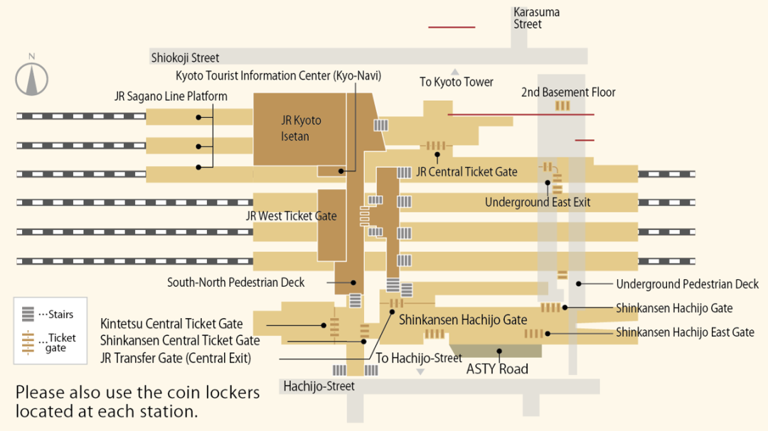 If the coin-operated lockers are full or your luggage is too large, you can use the luggage storage counter located on the B1 Floor of Kyoto Station, next to the JR Underground Central Exit. Staff will inspect your items and provide a storage receipt, which you’ll use to retrieve your luggage later.