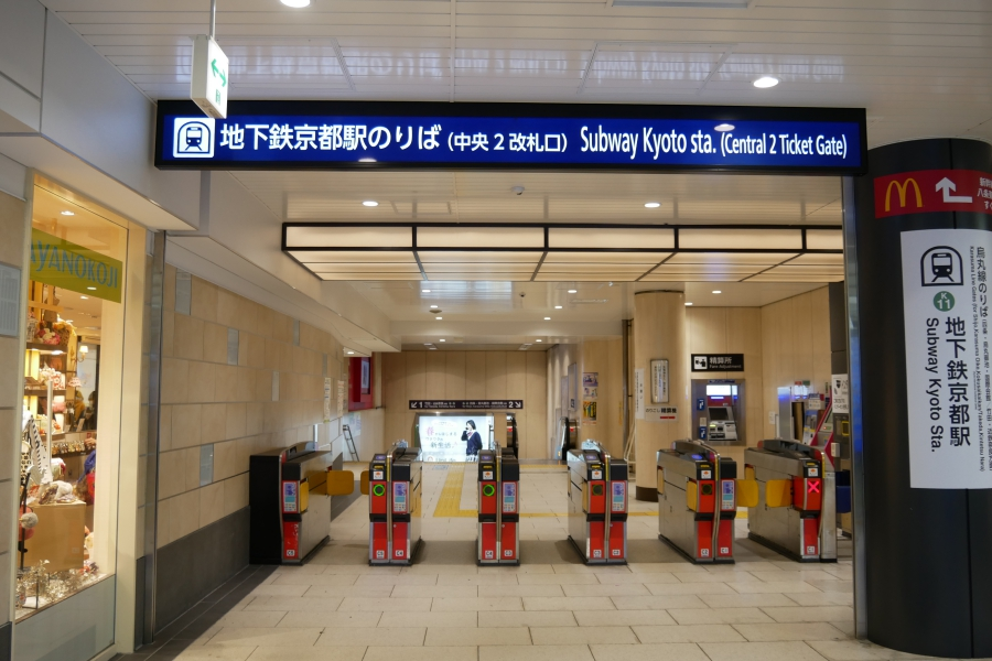 The subway is located on B2 Floor of Kyoto Station, with four entrances: North Ticket Gate, Central 1 Ticket Gate, Central 2 Ticket Gate, and South Ticket Gate. The JR Underground East Exit Ticket Gate is near the Central 2 Ticket Gate, making it the most convenient transfer point between the subway and JR lines. The subway has six exits: Exits 1-2 lead to Shiokoji Street, Exit 5 to the station’s north side and plaza, and Exit 6 to the bus terminal, taxi stands, and Porta Underground Shopping Street. The subway operates two lines—the Tozai Line (East-West) and Karasuma Line (North-South)—with Kyoto Station on the Karasuma Line. For central Kyoto, disembark at Karasuma Oike, Kyoto Shiyakusho-mae (City Hall), or Sanjo Keihan; for Nijo Castle, use Nijojo-mae Station.