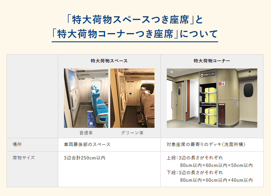 Starting in May 2020, passengers on Tokaido, Sanyo, Kyushu, and Nishikyushu trains with luggage measuring between 160cm and 250cm in length, width, and height will be required to reserve a seat in advance. Failure to do so will incur a 1,000 yen baggage fee (except for all non-reserved seats).