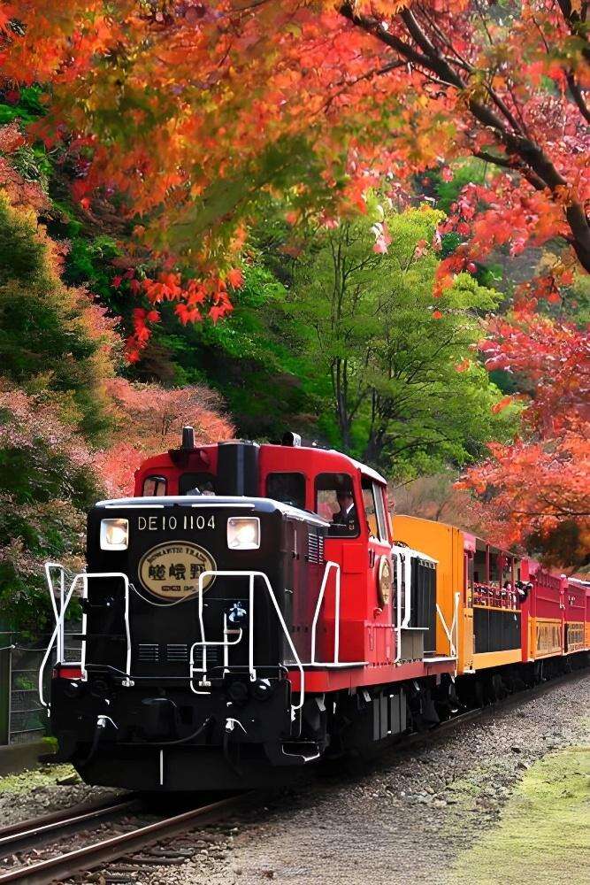 The train traverses the valley, offering views of cherry blossoms in spring, lush green forests in summer, and a vibrant orange train amidst a sea of red maples in autumn, blending seamlessly into the natural landscape. Winter transforms the train into a world of silver, offering a captivating array of seasonal charm.