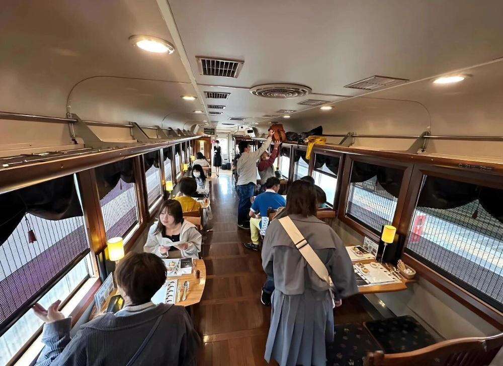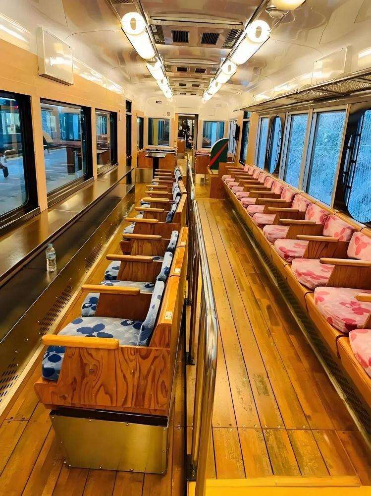 The Aotankichi sightseeing train consists of four carriages, and the main body has been converted from a 12200 limited express train. To improve comfort, the number of seats has been significantly reduced by two-thirds to 84, with approximately 2 to 3 seats per train. All seats are reserved. The first train departs Osaka Namba in the morning and arrives in Kyoto via Nara. It then repeats the Kyoto-Nara route twice, and finally departs Kyoto via Nara and returns to Osaka Namba. Passengers can enjoy the beautiful scenery along the way and enjoy a high-quality train journey!