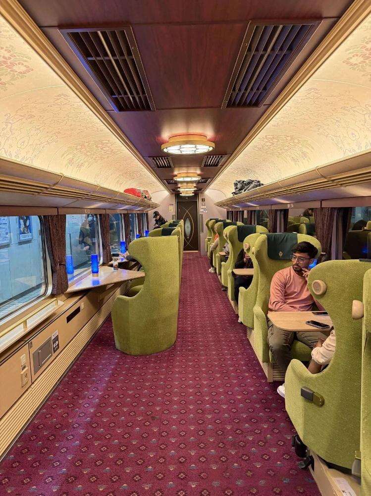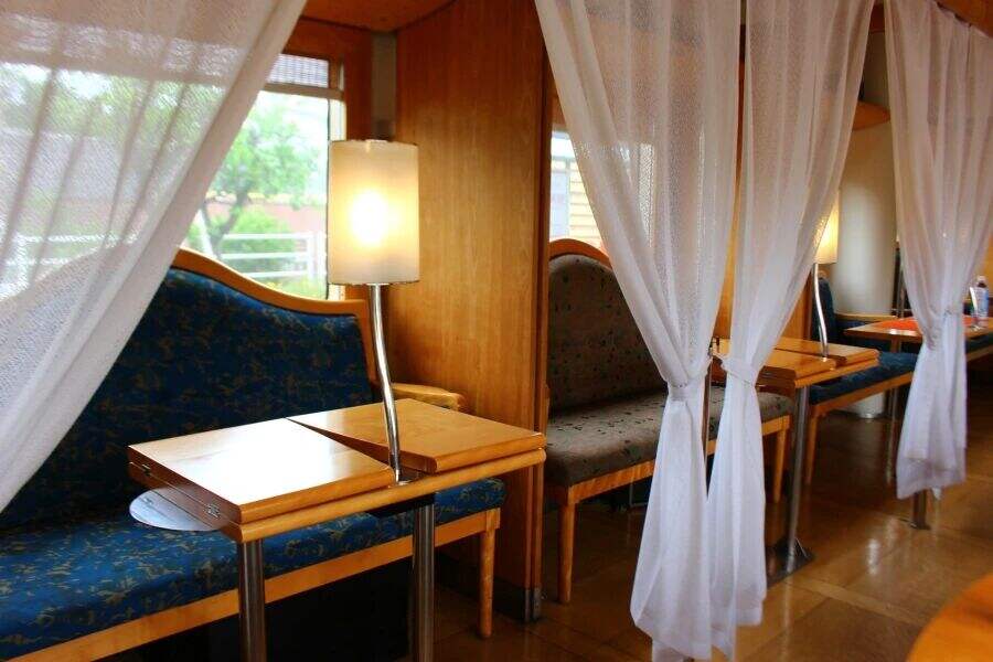 The train's interior design is inspired by a hotel lobby and cafe restaurant, offering breakfast, lunch, and sunset dinner set menus.