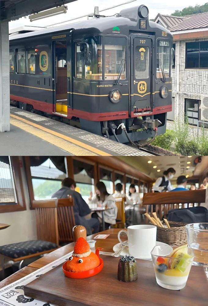 As its name suggests, the Kuromatsu is a black sightseeing train. Its retro design exudes an imposing presence. Besides its strikingly refined exterior, the Kuromatsu's most appealing feature is its status as a "high-end mobile restaurant"! Different meals are offered at different times of the day, including breakfast (Monning Coke), lunch (Ranchi Coke), and dessert (Suitsu Coke). The ingredients and contents vary with the season. The interior, reminiscent of a fine restaurant, exudes a calm and restrained atmosphere with its wooden design. If compared to a personified figure, it resembles a gentleman with rich character and exceptional taste.