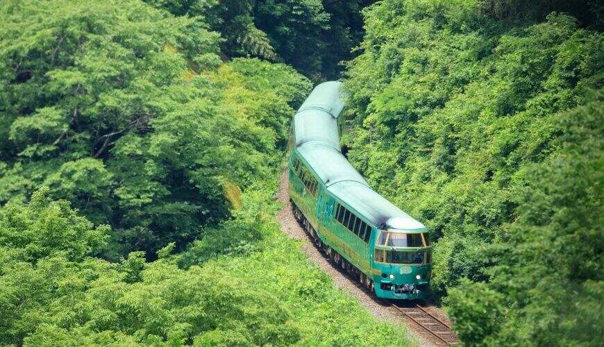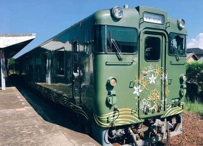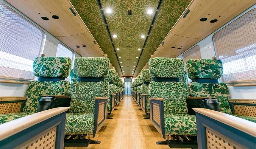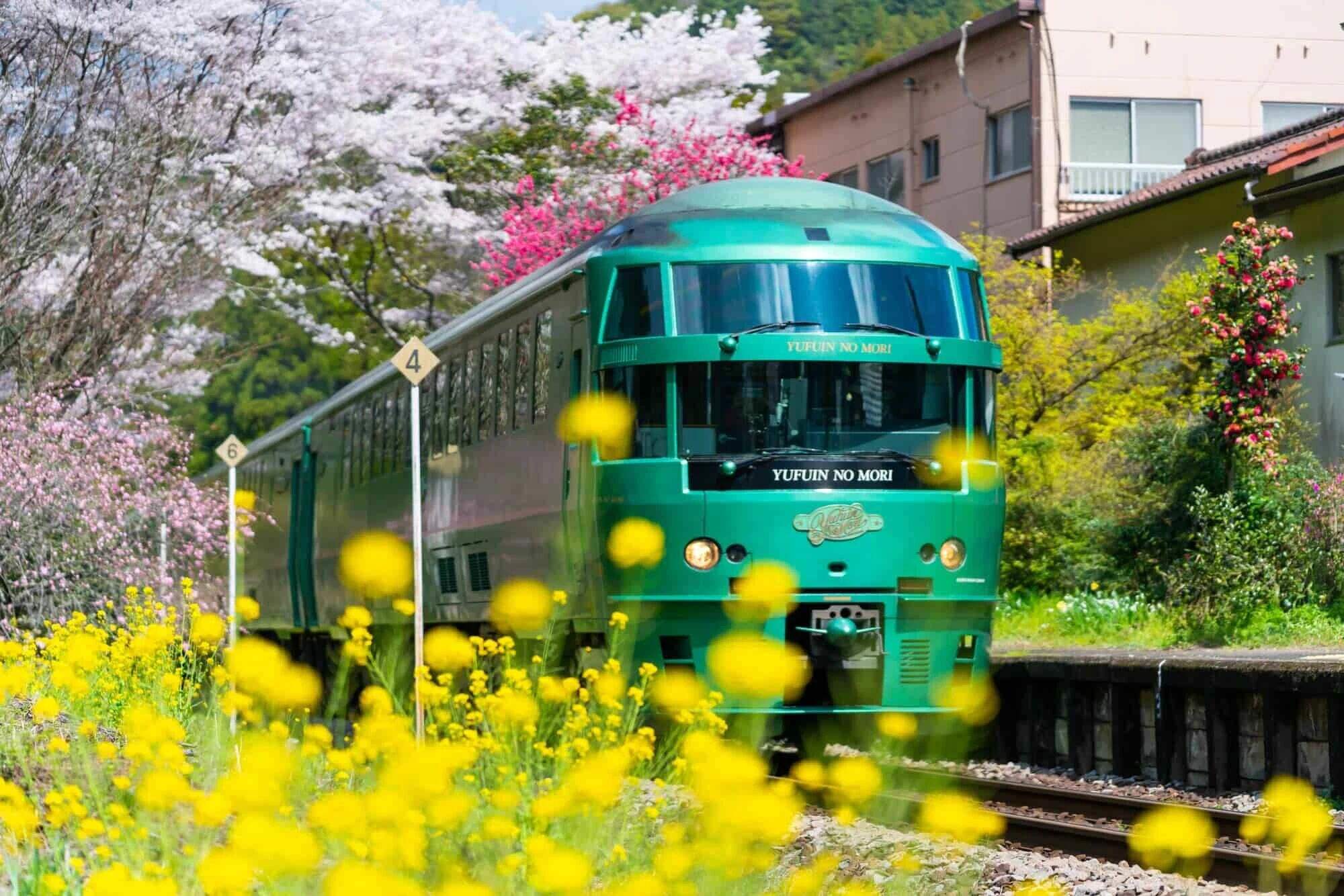 The Yufuin-no-Mori train, which began operating in 1989, runs between Hakata and Fuin Station and is nicknamed the "Forest Train." It passes through the beautiful Kyushu countryside and forests. Its dark green bodywork complements the forested scenery along the way. The elegantly decorated carriages and elevated seating offer passengers the best views of the scenery.