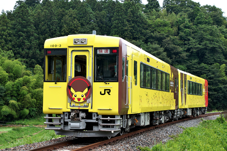 This Pikachu-themed train runs between Ichinoseki Station and Kesennuma Station. The train is filled with adorable Pikachu figurines, with Pikachu footprints scattered across the yellow floor. The curtains, seats, backrests, and luggage racks also feature Pikachu designs.