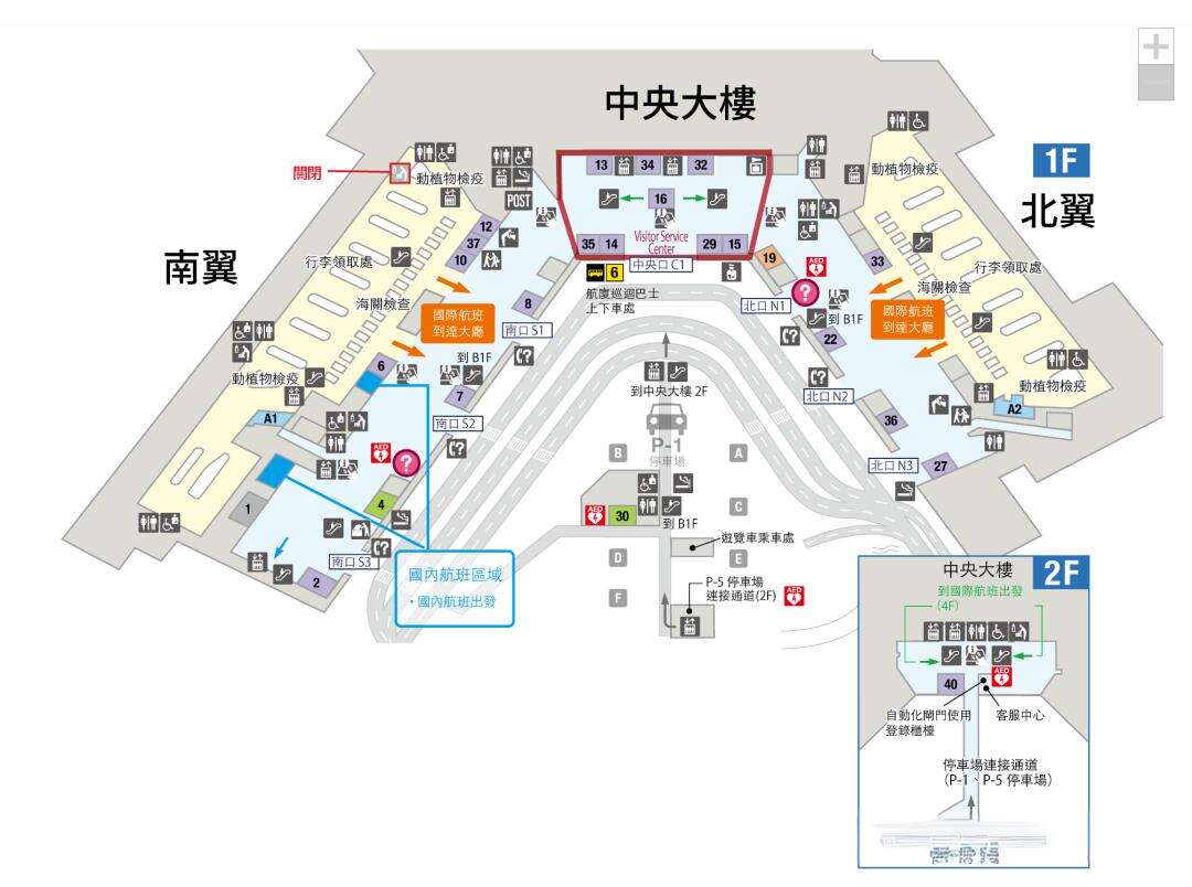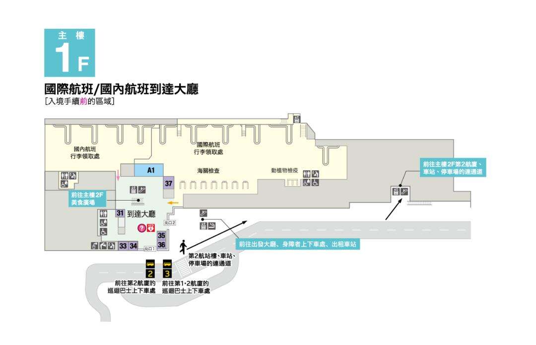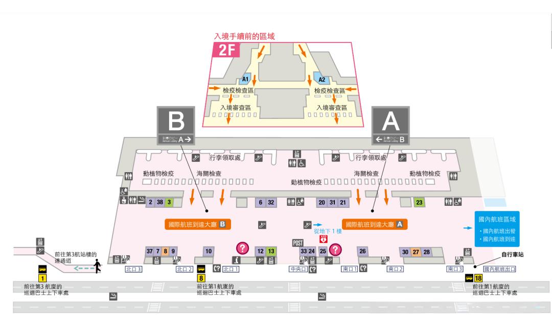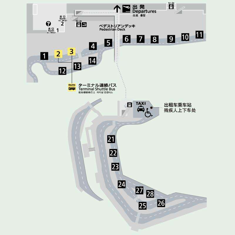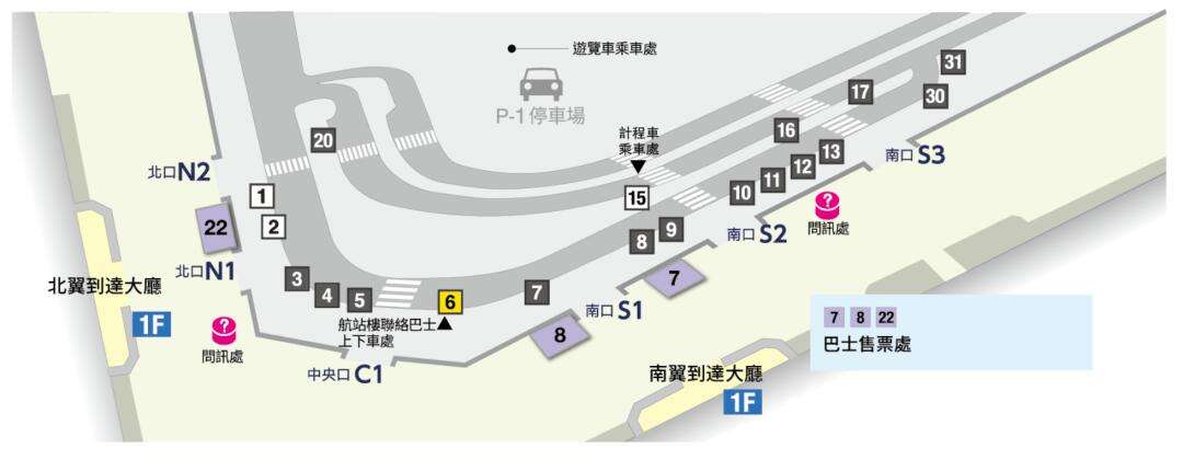 - ayout Structure: Shaped like an inverted "V". The first-floor arrival hall is divided into the Central Building, North Wing, and South Wing. The North and South Wings each have 3 exits, while the central section has a Central Exit. Outside these exits are the bus boarding areas.