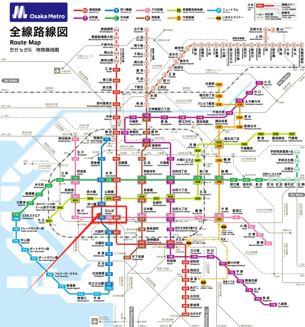 Although it's called "Namba Station" in Japanese, each station has different names and spellings depending on the subway company: Osaka Metro uses the katakana spelling "Namba Station," JR uses "JR Namba Station," Nankai Electric Railway uses "Nankai Namba Station," and Kinki Electric Railway and Hanshin Electric Railway use the unified name "Osaka Namba Station." Therefore, after confirming your destination, first confirm which line you want to take, then check the station name to avoid taking the wrong line.