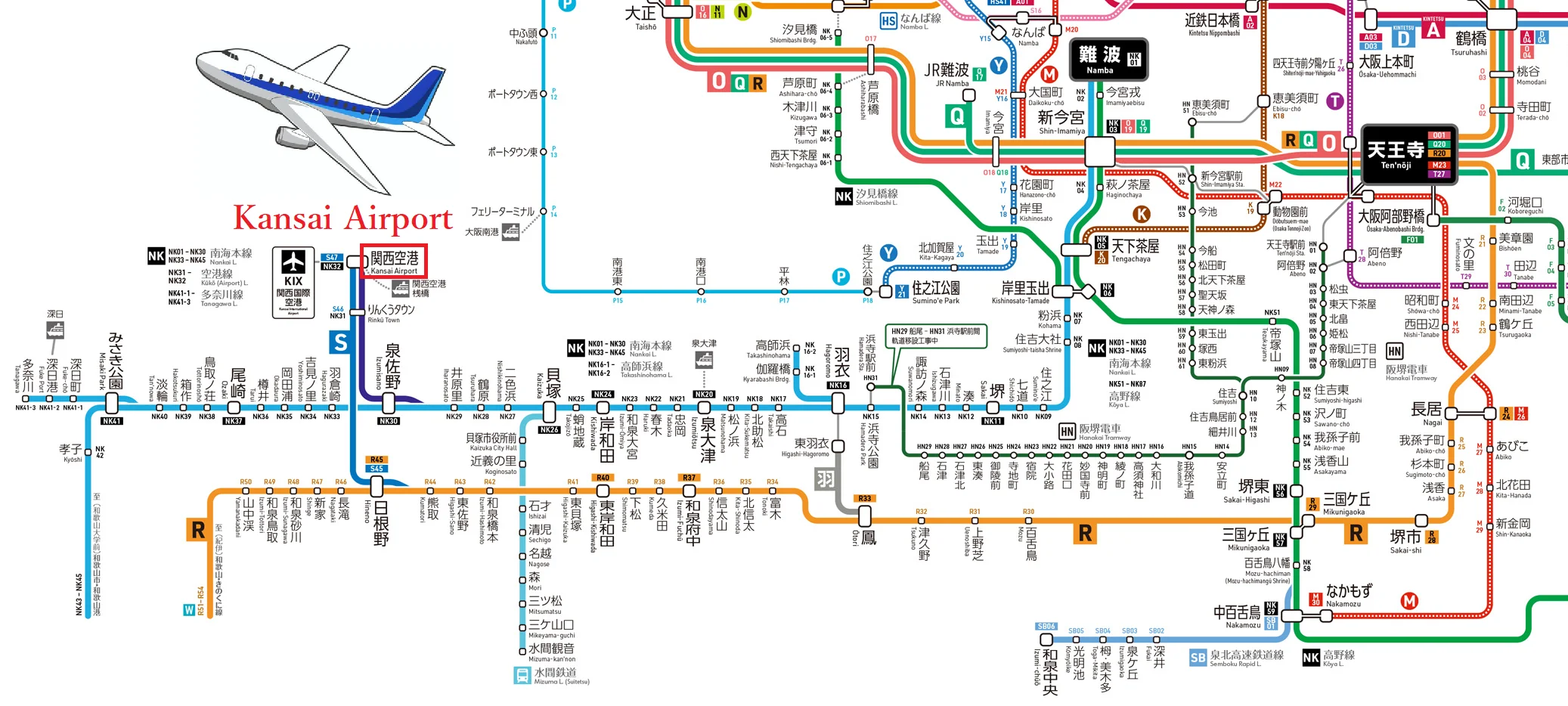 Osaka's city center is primarily served by the Osaka Metro. The Osaka Loop Line is the most popular JR line. The JR Kyoto Line connects to Kyoto in the north, the JR Tozai Line runs in the middle, and the Yamato Line connects to Tennoji in the south. The Nankai Electric Railway primarily connects Kansai Airport to the city center. The Kintetsu Railway primarily connects Osaka to Kyoto, Nara, Mie, Nagoya, and other destinations. The Hanshin Electric Railway primarily connects to Amagasaki Station for connections to Kobe and other areas of Hyogo Prefecture. Therefore, Namba Station offers connections to other areas in Kansai.