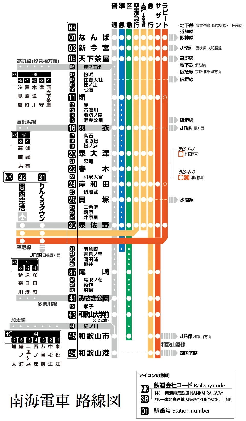 Travelers who have traveled independently in Kansai are undoubtedly familiar with Nankai Railway's Nankai-Namba Station. With the Limited Express Rapi:t running daily between Kansai International Airport and Namba, it's the most frequently used route for international travelers entering downtown Osaka. Constructed alongside the Takashimaya Department Store, Nankai-Namba Station boasts a striking exterior and is a highly visible landmark. It serves two lines: the Koya Line (bound for Shiomibashi and Koyasan) and the Nankai Line (which connects to the Airport Line). To reach Kansai International Airport, be sure to take the Nankai Line and transfer to Izumisano Station. The Limited Express Rapi:t offers direct access to the airport without a transfer, with a single trip taking as little as 35 minutes.