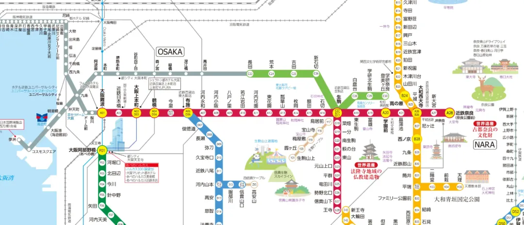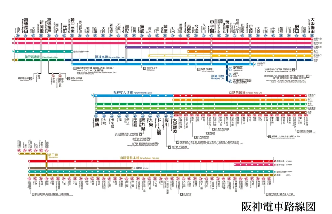 Osaka-Namba Station is a joint venture between the Kintetsu and Hanshin lines. The Kintetsu line primarily operates medium- and long-distance routes, with Osaka as its westernmost station, radiating south, east, and north. Its northernmost point reaches Kyoto, its southernmost point reaches Yoshino in Nara Prefecture, and its easternmost points reach Ise-Shima in Mie Prefecture and Nagoya in Aichi Prefecture. Therefore, if you're traveling east from Osaka to Nagoya, the Kintetsu line is the best choice. The Hanshin line, on the other hand, connects with Osaka as its easternmost station, extending westward to Koshien and Kobe Sannomiya. Osaka-Namba Station connects the Kintetsu Nara Line and the Hanshin Namba Line, allowing for seamless travel between Nara and Kobe. It serves as a crucial hub for travelers in the Kansai region.