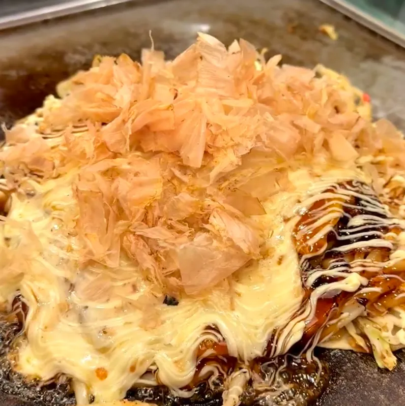 Okonomiyaki is one of Osaka's signature dishes. Essentially, it's a Japanese vegetable pancake filled with a variety of ingredients (cabbage, pork, shrimp, octopus, etc.) and grilled on a teppan. It's topped with sauce and mayonnaise, and sprinkled with dried bonito flakes and nori seaweed. Senbei in Namba, a long-established okonomiyaki restaurant near Dotonbori, is known for its generous portions and authentic flavor.