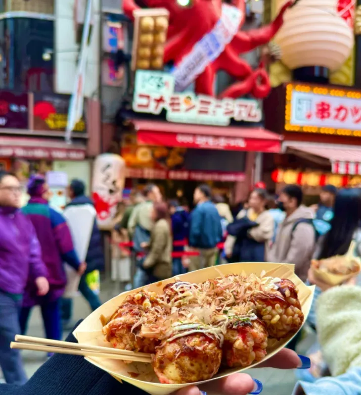 Takoyaki is one of Osaka's most popular street food. These round balls contain a whole octopus, making them crispy on the outside and tender on the inside. Takoyaki are incredibly delicious. On every corner of Namba Dotonbori, you'll find freshly made takoyaki stalls. Perhaps the most famous is Aizuya, a long-established shop founded in 1916 and known as the "Originator of Takoyaki." It's always packed with customers.
