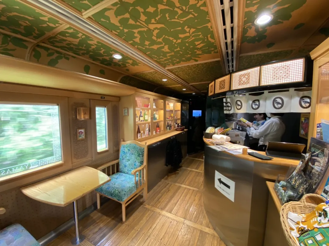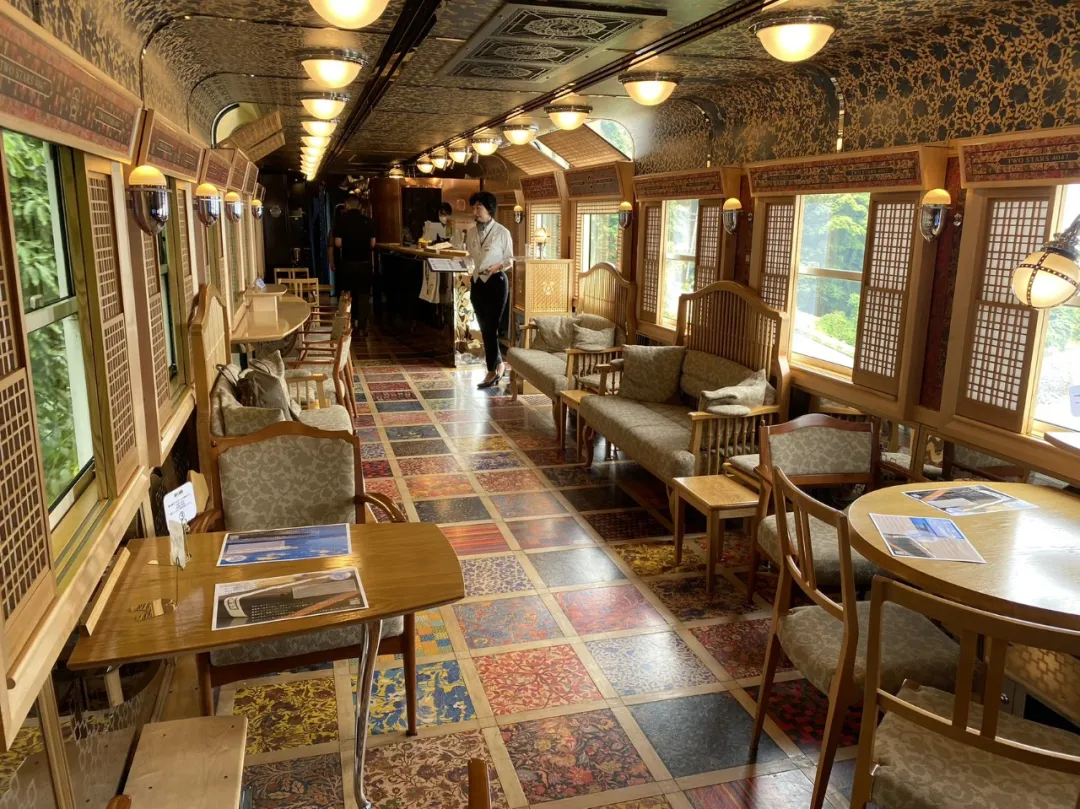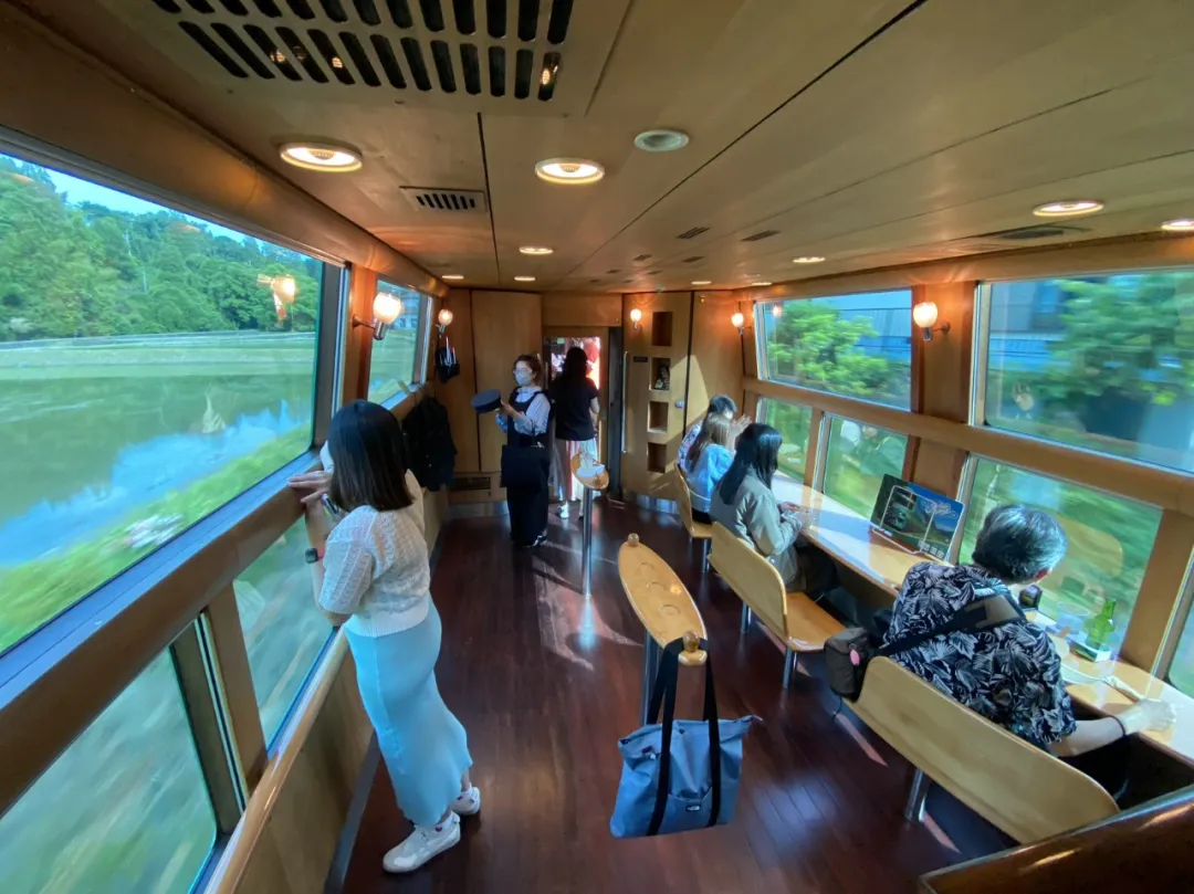 There's also a special restaurant car with almost panoramic windows. As we near the end of the train, we slowly pass through a forest, and the feeling of being surrounded by greenery truly makes us feel like we're on a "forest train."
