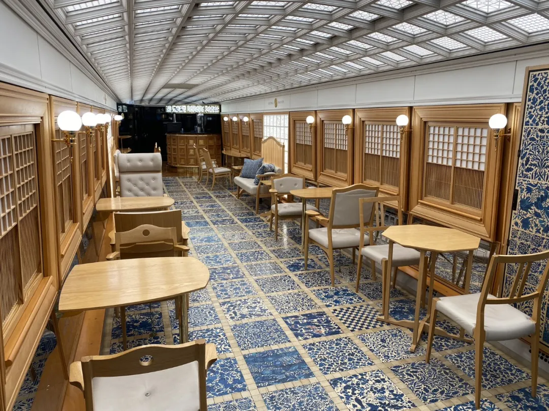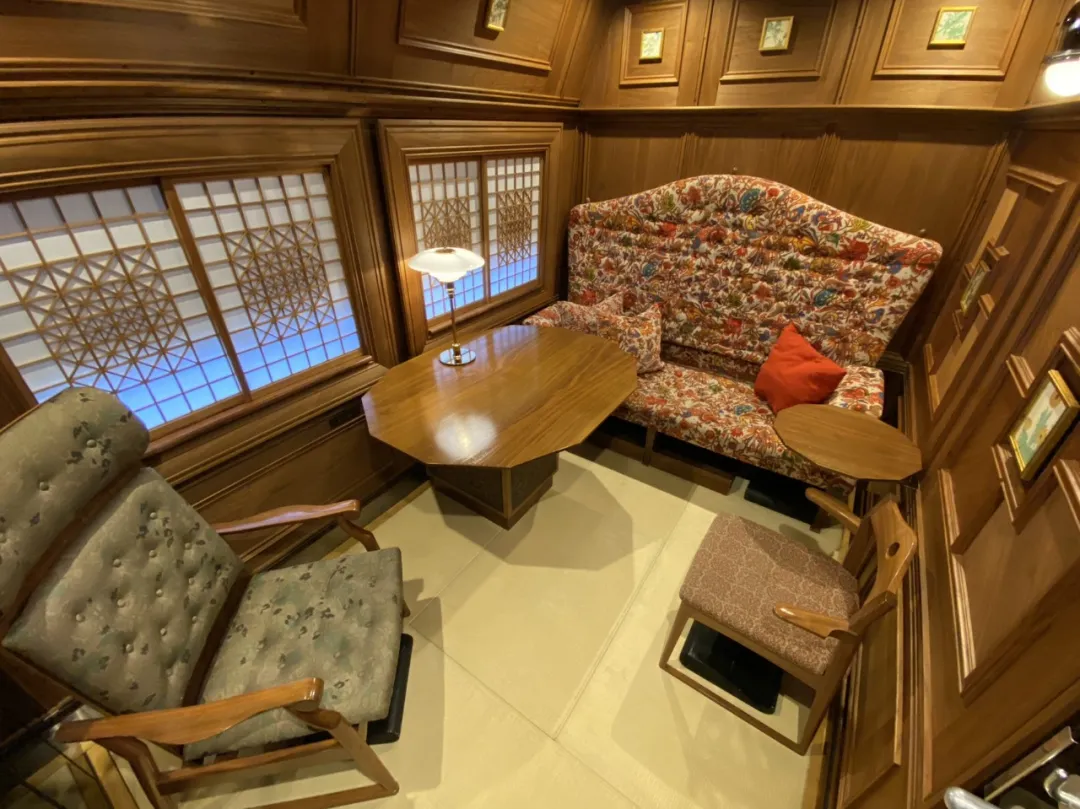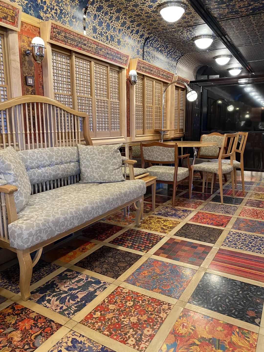 Inside, Lounge 40 serves as a public lounge. From the wooden window frames to the intricately patterned flooring, to the quaint benches and lighting, it's hard not to be struck by the charm of the train for the first time.