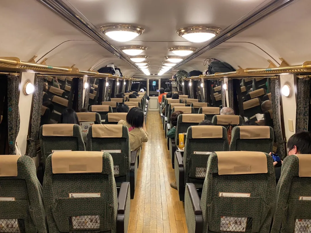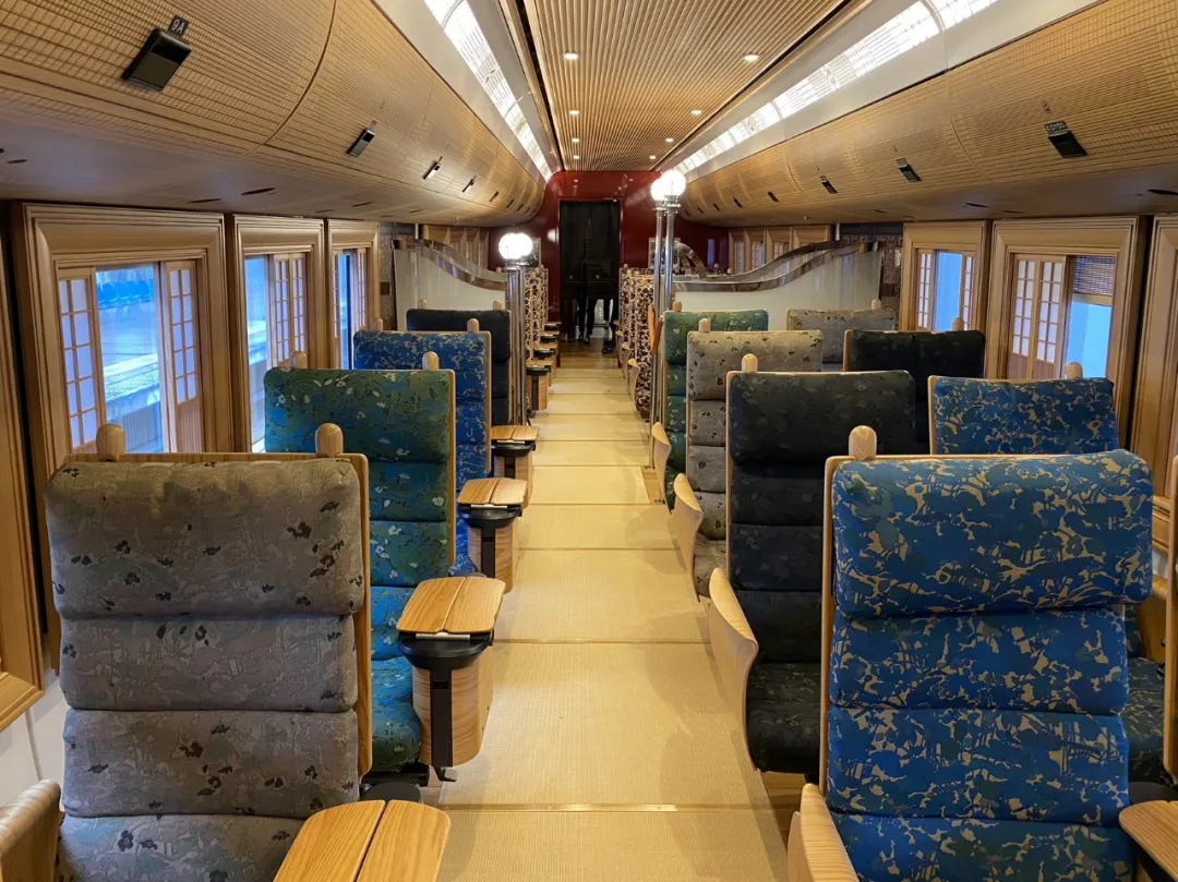 There are two ordinary seating carriages, one with floor and the other with tatami. The layout and design of the seats are very textured, and even the luggage racks are full of small details.