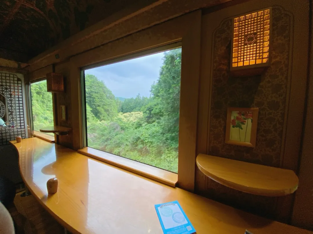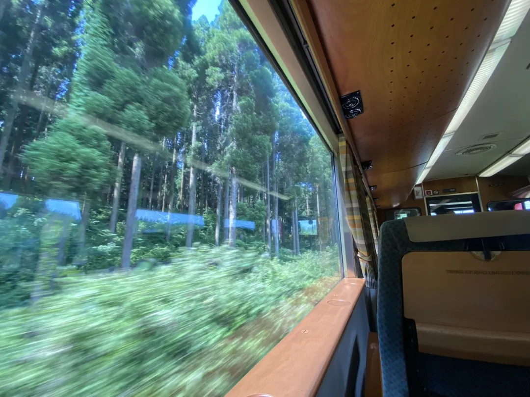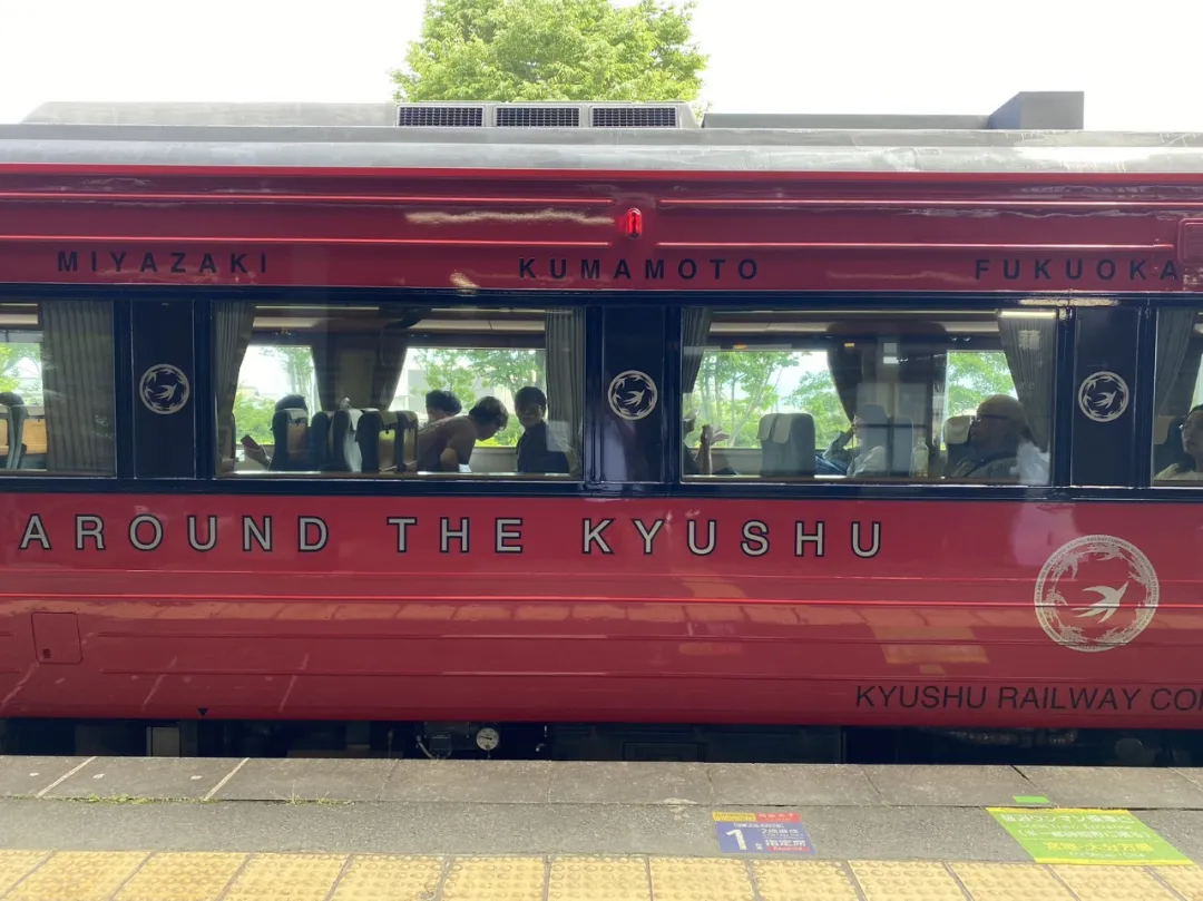 Because of its name, I took a ride: the Kyushu Cross-Island Express. Its red body, reminiscent of Mount Aso, departs from Beppu and traverses central Kyushu. Through this window, I could see the most exquisite Kyushu scenery.