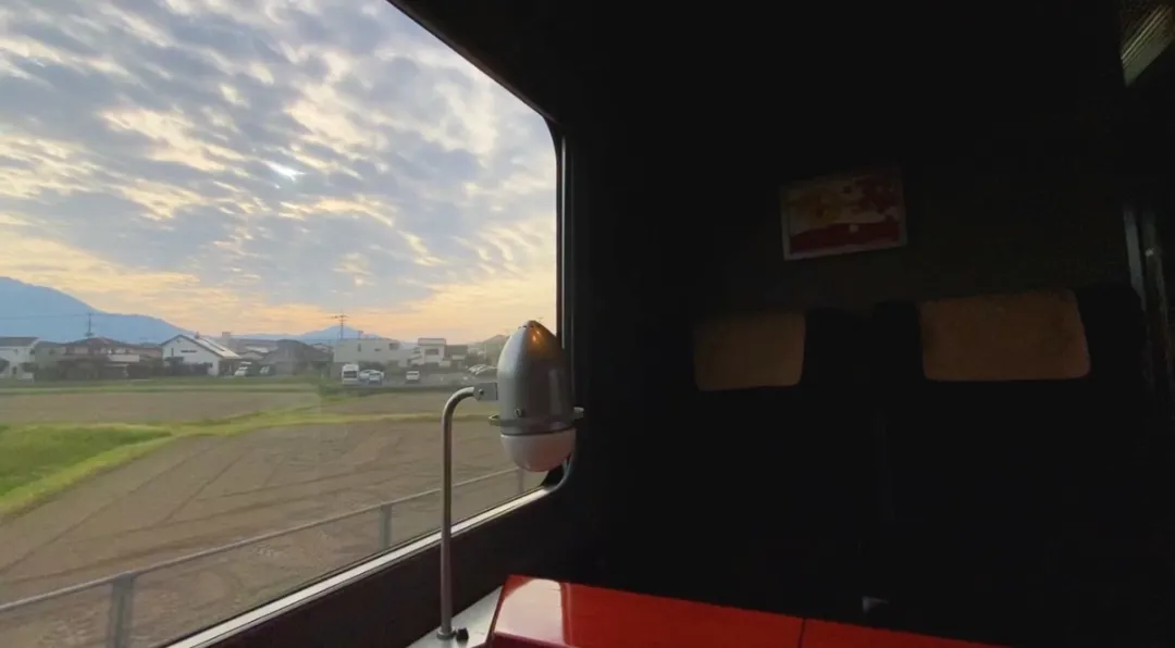 The morning in Fukuoka's countryside was seen through another window. Departing Hakata early in the morning on the Seagull Relay, the sun slowly rising beside us, illuminating the entire carriage, was the perfect start to the day.