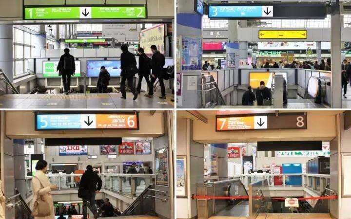 When transferring from Line 5 and later platforms, proceed in the opposite direction of the Shinkansen boarding area and head for the KIOSK convenience store.