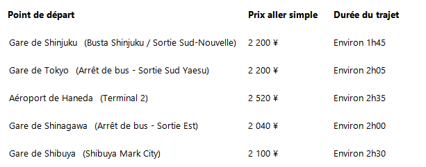 Shinjuku est le point de départ le plus pratique pour se rendre aux Cinq Lacs du Fuji, suivi de la gare de Tokyo. Compte tenu de la commodité de Shinjuku, il est recommandé de commencer votre voyage par là dès que possible, quel que soit votre lieu de séjour. Il existe de nombreuses options de transport aller-retour, mais les suivantes méritent vraiment d'être envisagées :